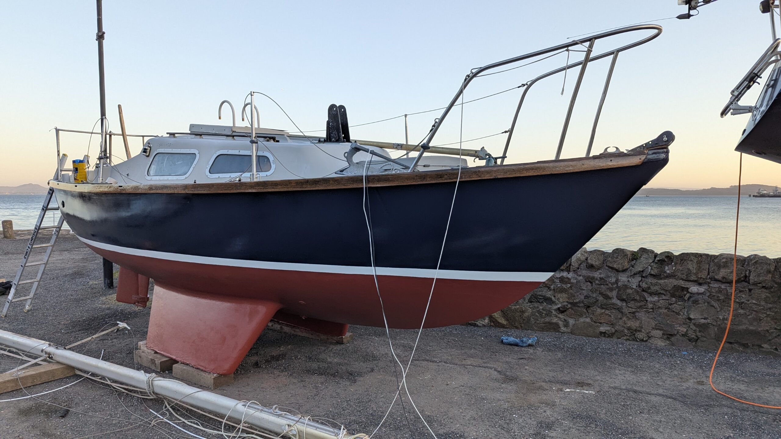 Hurley 22 sailing yacht, lying on a club mooring at Aberdour. Sturdy and seaworthy 22-footer with a Yamaha 8hp outboard (runs well), sails and rigging all present, and four berths below.